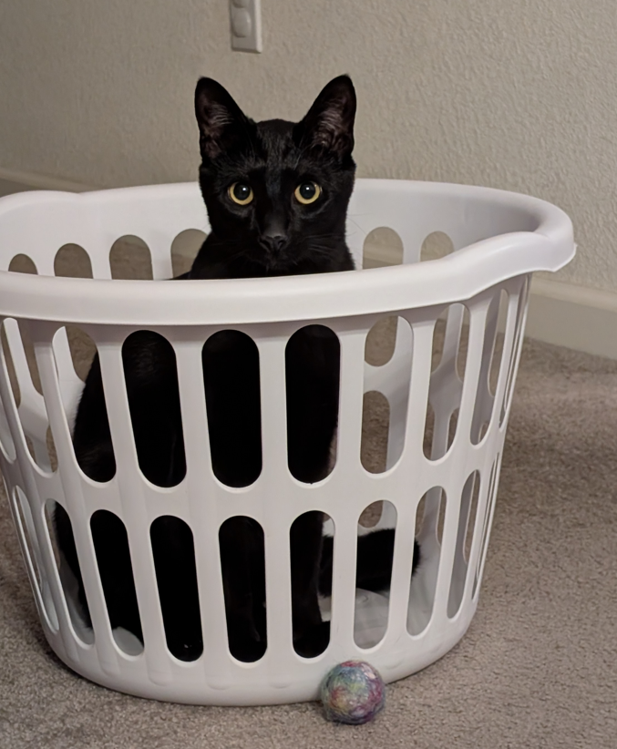 He does have a little patch of white fur on his chest. So at least I can tell him apart from my last black cat (in some pictures, anyway). My last black cat was regal. This one is a silly boy.